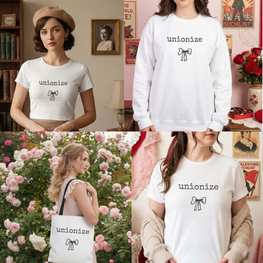 The Unionize Bow Minimalist line uses that soft, delicate bow to represent being “tied together.” It’s a subversion—taking something traditionally “soft” and using it to deliver a hard-hitting message of labor solidarity.